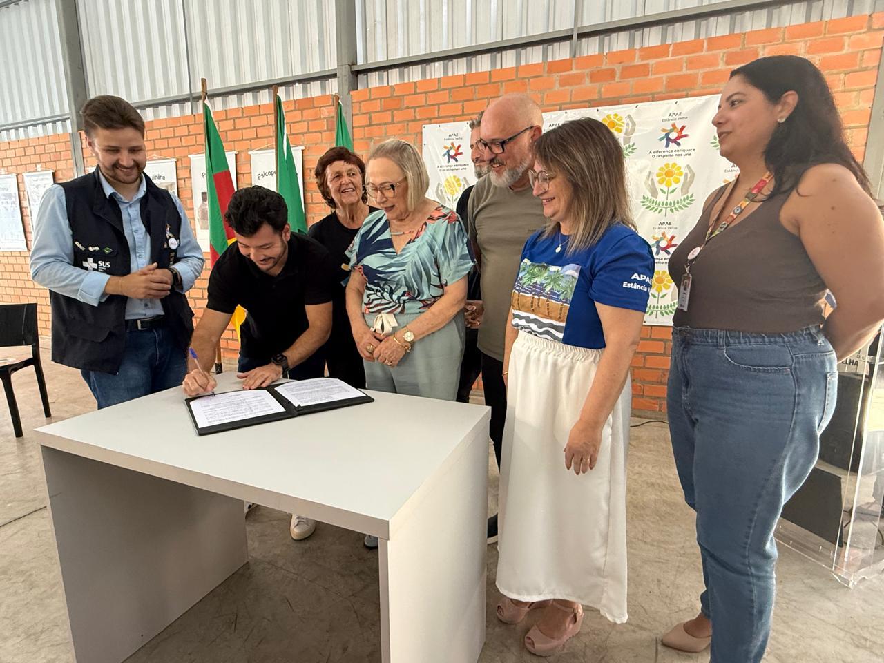 Estância Velha - A sexta-feira, dia 20 de março, ficou marcada por mais um grande avanço nas políticas públicas de atendimento e inclusão em Estância Velha. Isso porque a prefeitura, junto com o Governo do Estado e a APAE realizaram a assinatura de adesão ao programa CAS TeAcolhe. O ato ocorreu na sede da entidade, no bairro Floresta, com presença da secretária Estadual de Saúde, Arita Bergmann e autoridades locais.