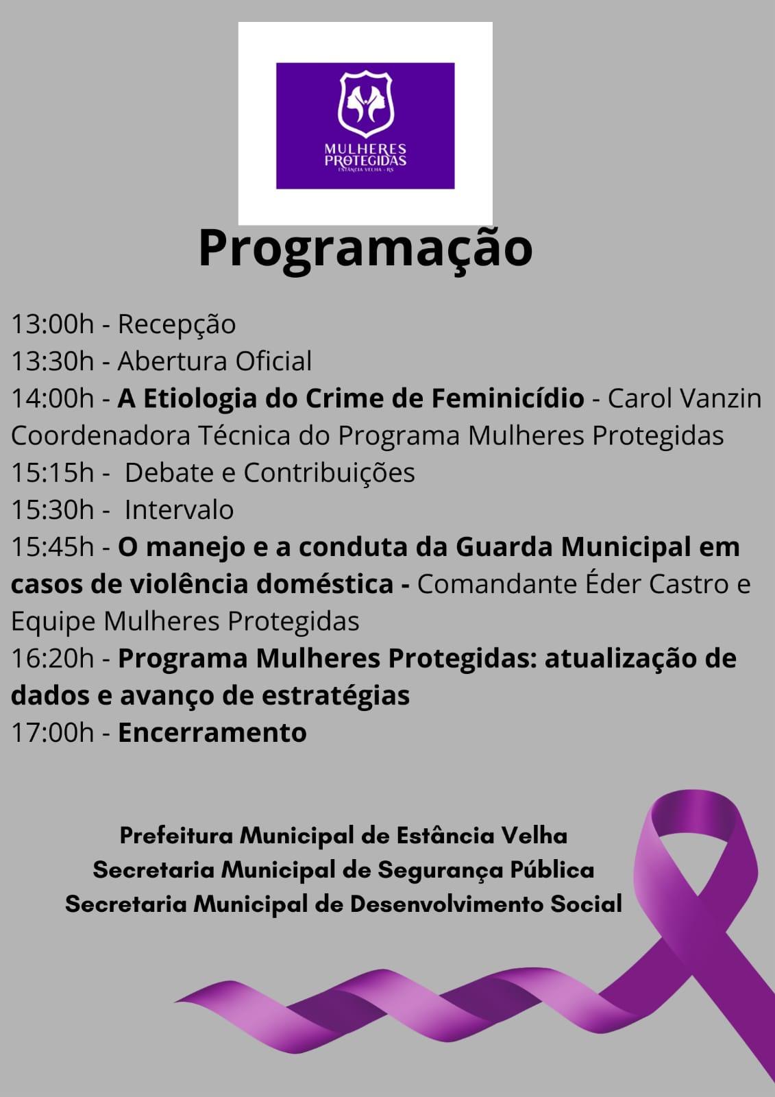 Estância Velha - O município promove nesta segunda-feira, dia 9 de março, o 2º Seminário Mulheres Protegidas. A iniciativa é realizada pelas Secretarias de Segurança, Esporte e Bem-Estar (SESEBE), de Desenvolvimento Social e Trabalho (SEDEST) e do Grupamento de Proteção à Mulher (GPM) da Guarda Cívil Municipal. O objetivo é ampliar o debate sobre o feminicídio, abordando causas, origens e motivações, tema que tem ganhado destaque nas manchetes policiais em todo o país neste início de ano.