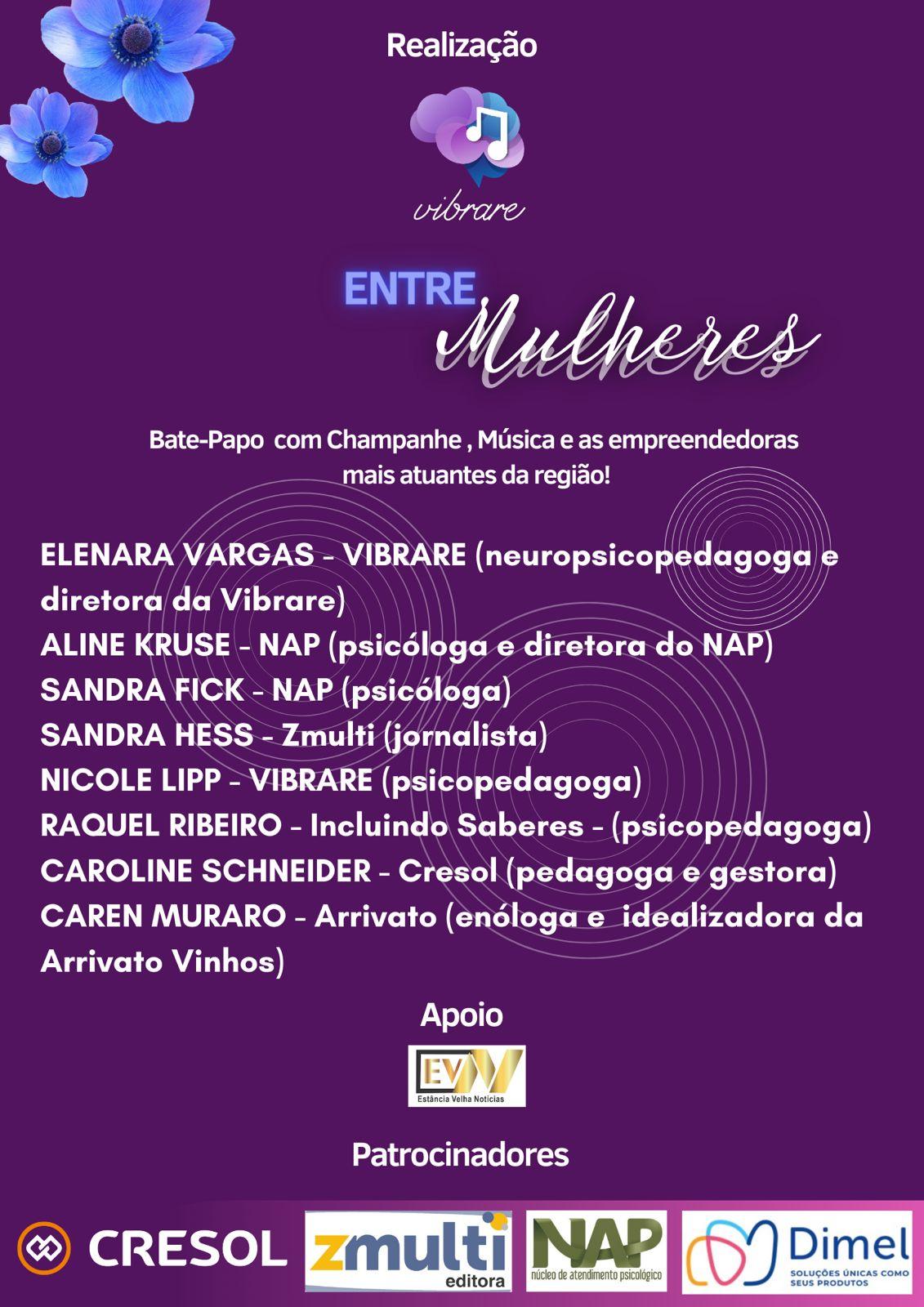 Para a roda de conversa estão convidadas as profissionais empreendedoras da região: Aline Kruse – NAP, Sandra Hess – Zmulti, Nicole Lipp – Vibrare, Raquel Ribeiro – Incluindo Saberes, Caroline Schneider – Cresol além de Caren Muraro – Arrivato e Elenara Vargas – Vibrare, criadora do projeto que abordaram o tema de acordo com suas atividades profissionais, acompanhadas de música ao vivo e espumantes. Este evento é exclusivo para mulheres. A entrada é gratuita. O Entre Mulheres tem patrocínio da Cresol, Dimel, NAP e Zmulti, e tem apoio do Estância Velha Notícias.