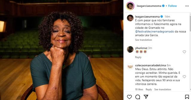 A informação do falecimento foi confirmada pelos familiares de Léa, nas redes sociais: "É com pesar que nós familiares informamos o falecimento agora na cidade de Gramado, no Festival de Cinema da nossa amada Léa Garcia". De acordo com o Hospital Arcanjo São Miguel, a causa da morte foi um infarto agudo do miocárdio. Ela estava circulando pelo Festival, que começou no último sábado, todos os dias. Chegou a posar sorridente na frente do troféu Kikito.