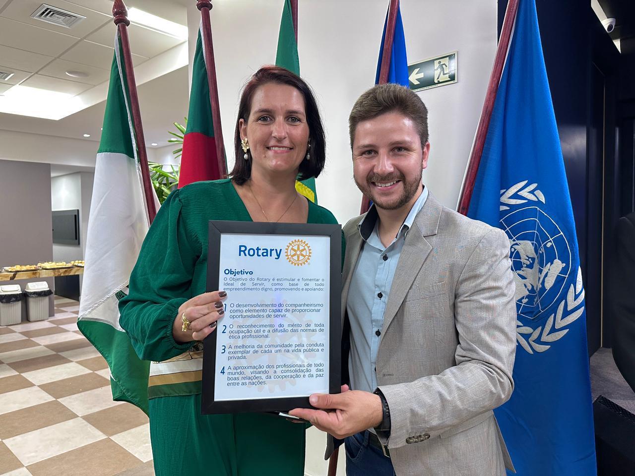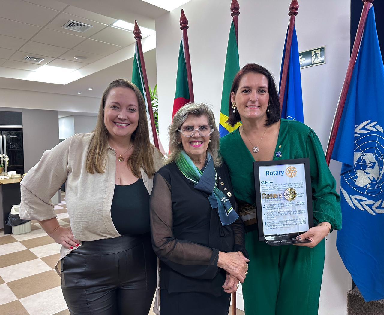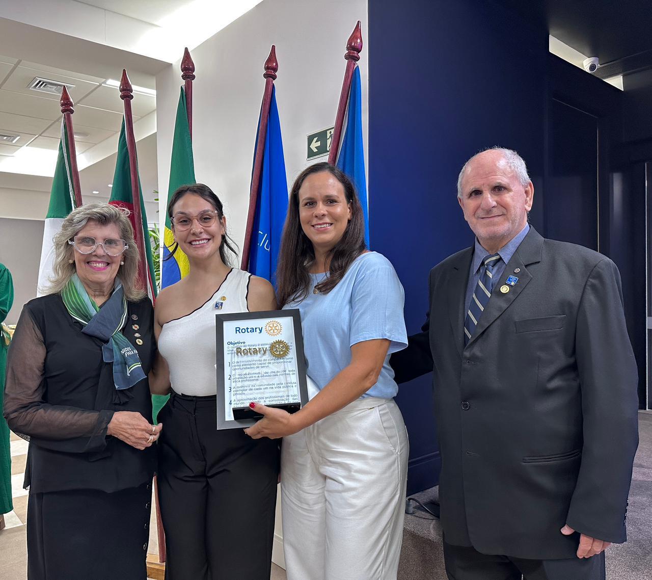 Celebrando o tema presidencial do ano rotário 2025/26, “Unidos para fazer o bem”, o club ganhou reforços importantes com a admissão das novas associadas Daniela e Rafaelli, apadrinhadas respectivamente por Kátia Dilkin Dutra e Sueide Elias Rezende. As novas integrantes receberam seus distintivos das mãos da Governadora do Distrito 4.670, Rosana Oppitz.